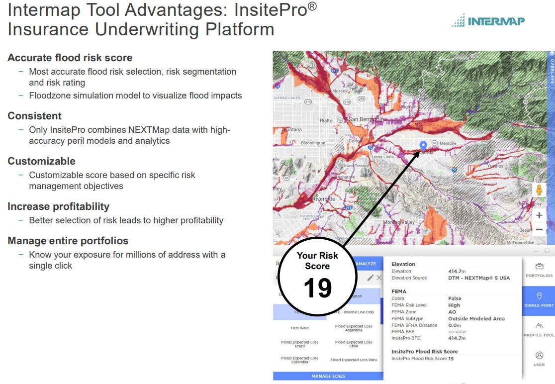 Data-as-a-Service: licensing software on annual subscriptions, which generates recurring revenue. An example is InsitePro, a software package for insurance underwriting that combines Intermap’s elevation data with third party data to make an assessment of natural catastrophe risk of specific locations, helping the insurers make informed decisions. Today more than 60 insurers already use InsitePro.