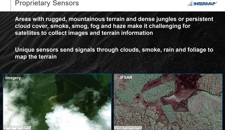 Intermap has a long history that goes back more than 100 years with one of its predecessor companies being the first to do aerial surveys for the US Army. They have a long history of doing aerial surveys, collecting data and making maps, often for governments. Before 1996 they were a part of Intera, but then Intera split up and the division of Intermap became an independent company that listed in 1997 on the Toronto Stock Exchange. With the split up Intermap had acquired the rights to a digital mapping technology IFSAR (Interferometic Synthetic Aperture Radar for Elevation), that was developed by the Environmental Research Institute of Michigan with funding from the US Defense Advanced Research Projects Agency (DARPA). That IFSAR is a very advanced radar technique that can be used to remotely (with sensors on planes or drones) collect data to map terrain. Intermap also has proprietary sensors that can send signals through clouds, smoke, rain and foliage, which gives them an advantage compared to other techniques. IFSAR is also relatively cost-effective compared to other techniques for data collection over large areas, which allowed Intermap to build out a business doing these type of surveys for governments and over the years also finding more and more commercial applications for the data they collected.